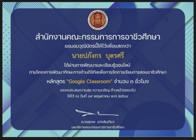 เกียรติบัตรออนไลน์ โครงการพัฒนาทักษะทางด้านดิจิทัล เพื่อการจัดการเรียนการสอนด้านอาชีวศึกษา ระหว่างวันที่ 17-31 พฤษภาคม 2564