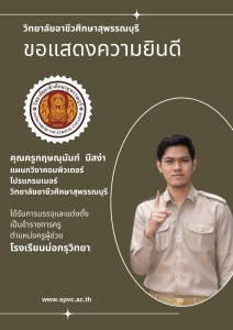 วันที่ ๙ พฤษภาคม ๒๕๖๕ วิทยาลัยอาชีวศึกษาสุพรรณบุรี โดย ดร.ศรากร บุญปถัมภ์ ผู้อำนวยการฯ พร้อมด้วยคณะผู้บริหาร ร่วมต้อนรับ คุณครูพิมพิดา ผะอบเหล็ก ได้รับการบรรจุและแต่งตั้งเป็นข้าราชการครูผู้ช่วย แผนกวิชาการจัดการสำนักงาน วิทยาลัยอาชีวศึกษาสุพรรณบุรี