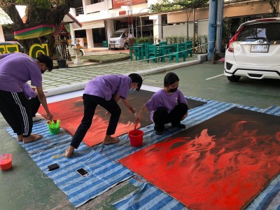 ทีมวากภาพที่ได้รับการคัดลือกให้เข้ารอบชิงชนะเลิศ 3 ทีม ปฏิบัติงานวาดถาพบนแผ่นไม้อัด ระหว่างวันที่ 26-29 มกราคม 2565 ณ โดมรวมน้ำใจ วิทยาลัยอาชีวศึกษาสุพรรณบุรี